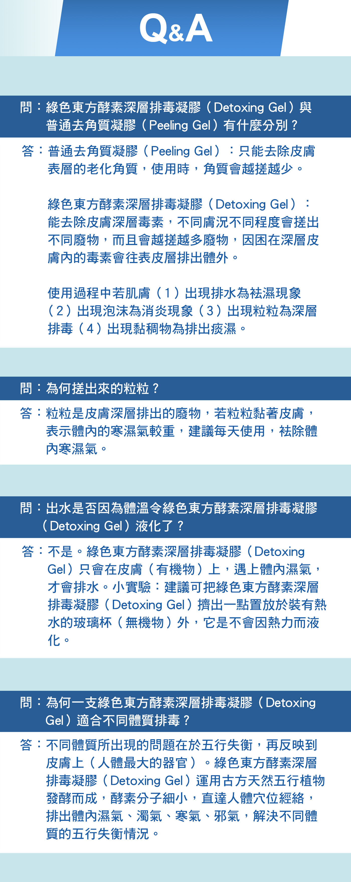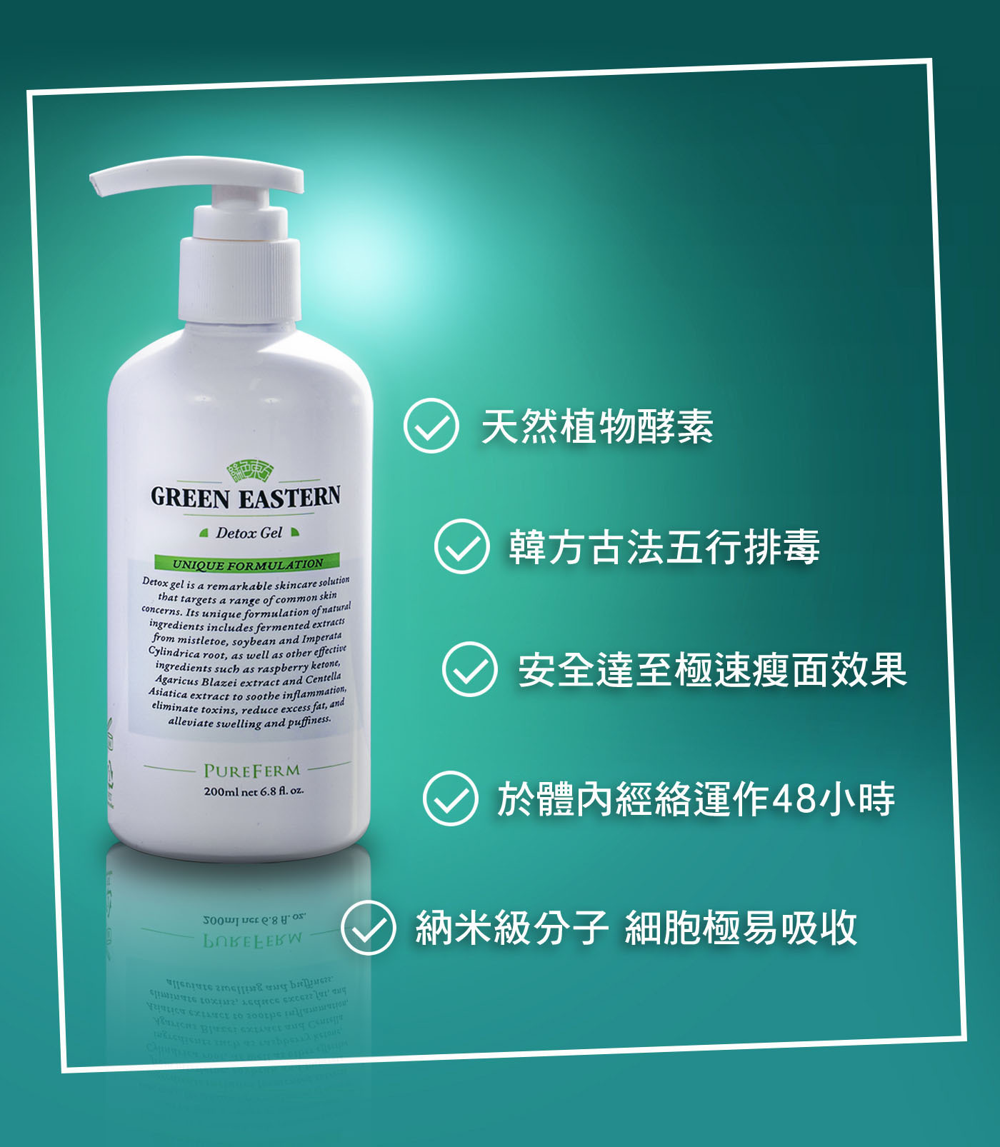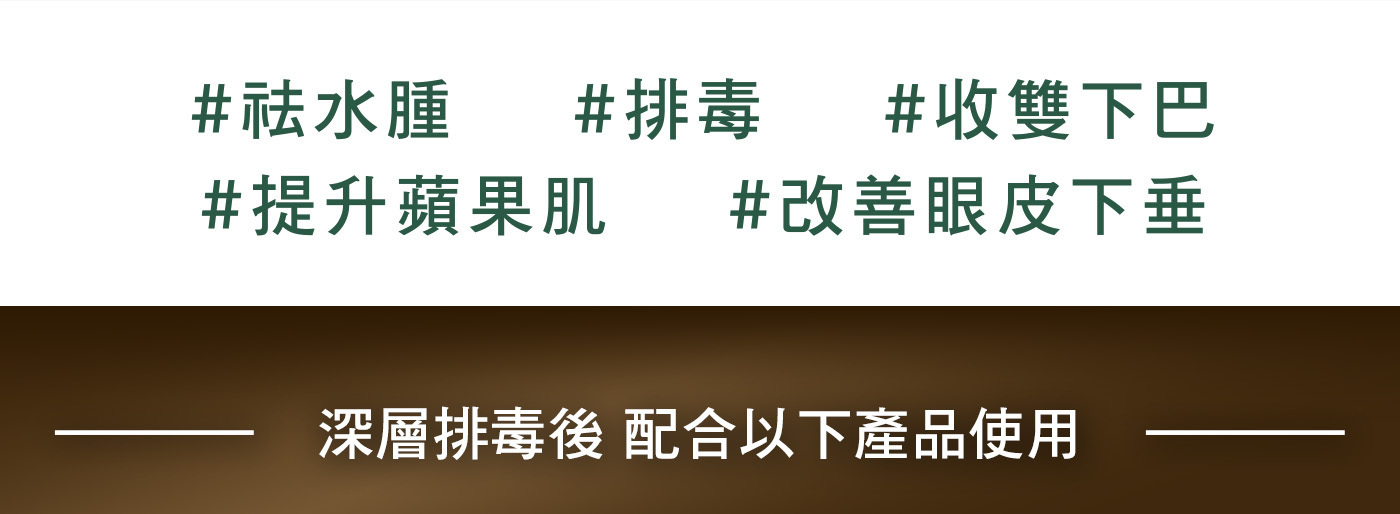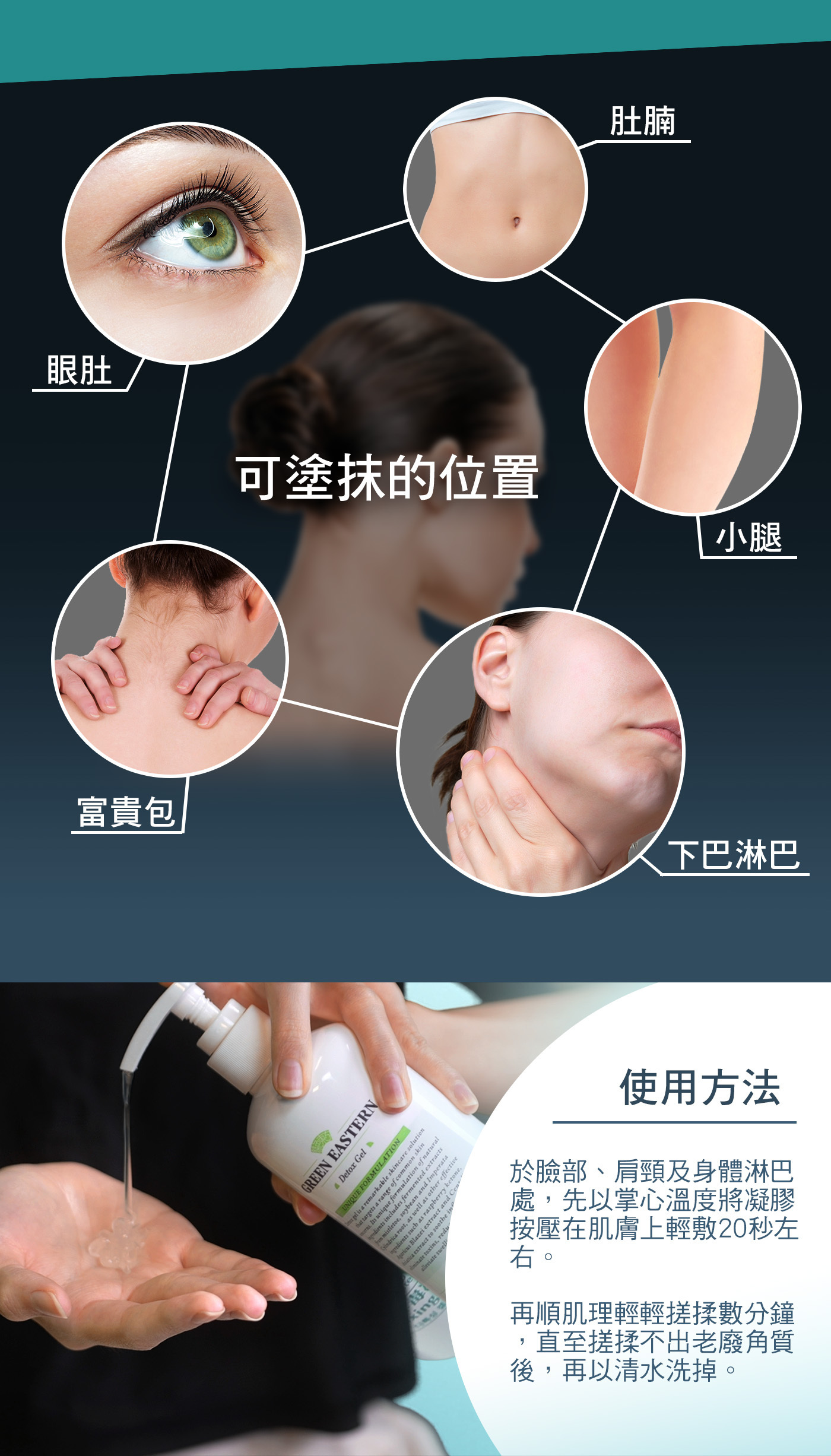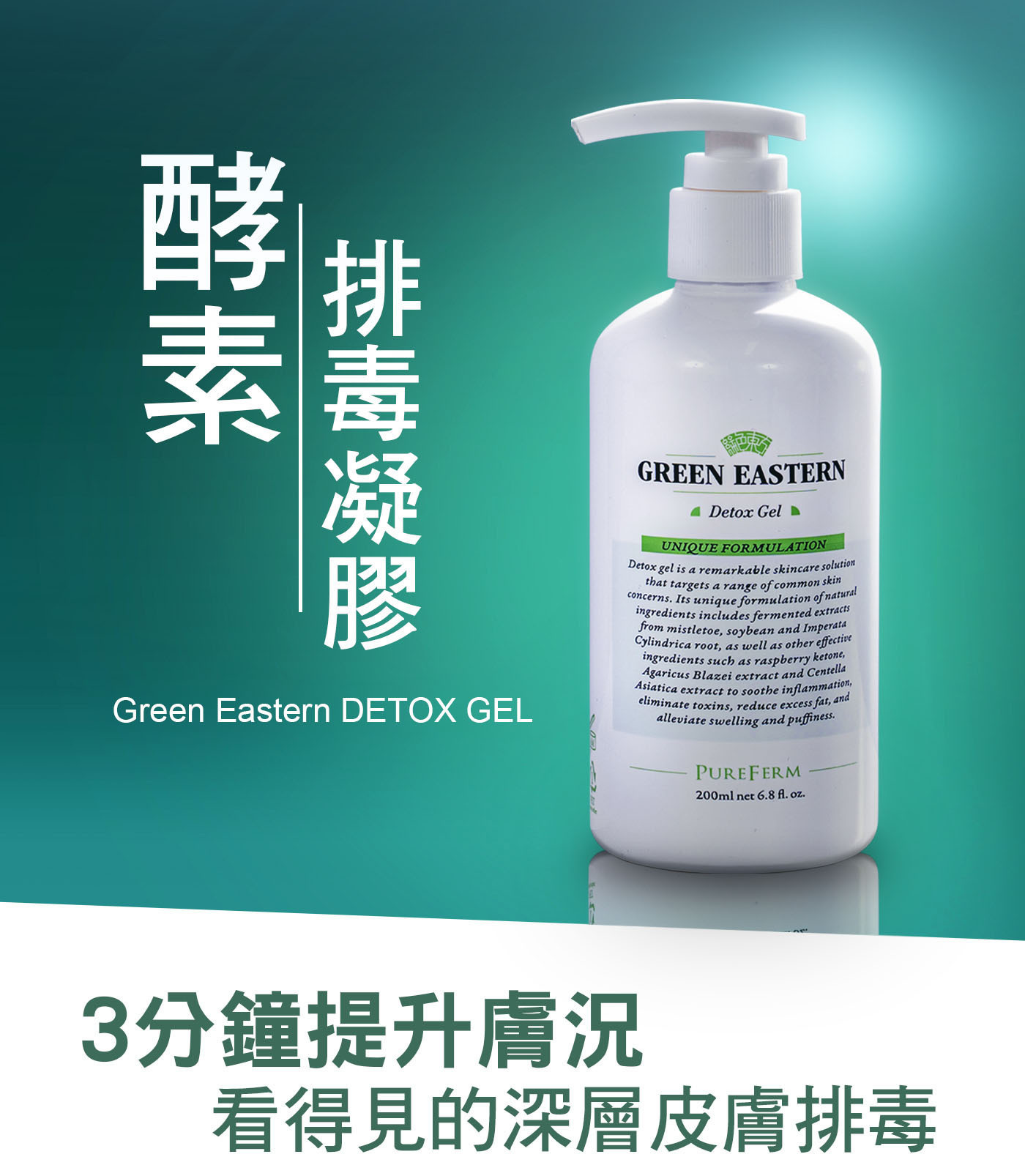 取自巴西高山落葉松茸、積雪草、紅花及大豆等多種植物,經發酵所製成的排毒去角質凝膠,可有效祛除臉部及身體的浮腫、毒素、血滯與老廢角質, 促進肌膚代謝,呈現彈力、光潔好膚色。