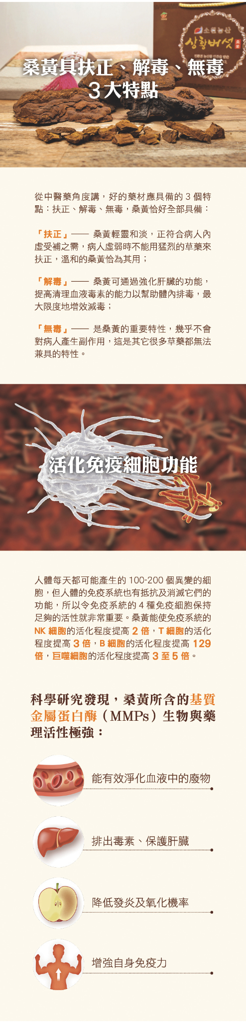 「解毒」—桑黃可通過強化肝臟的功能,提高清理血液毒素的能力以幫助體內排毒,健肝、護肝,最大限度地增效減毒;