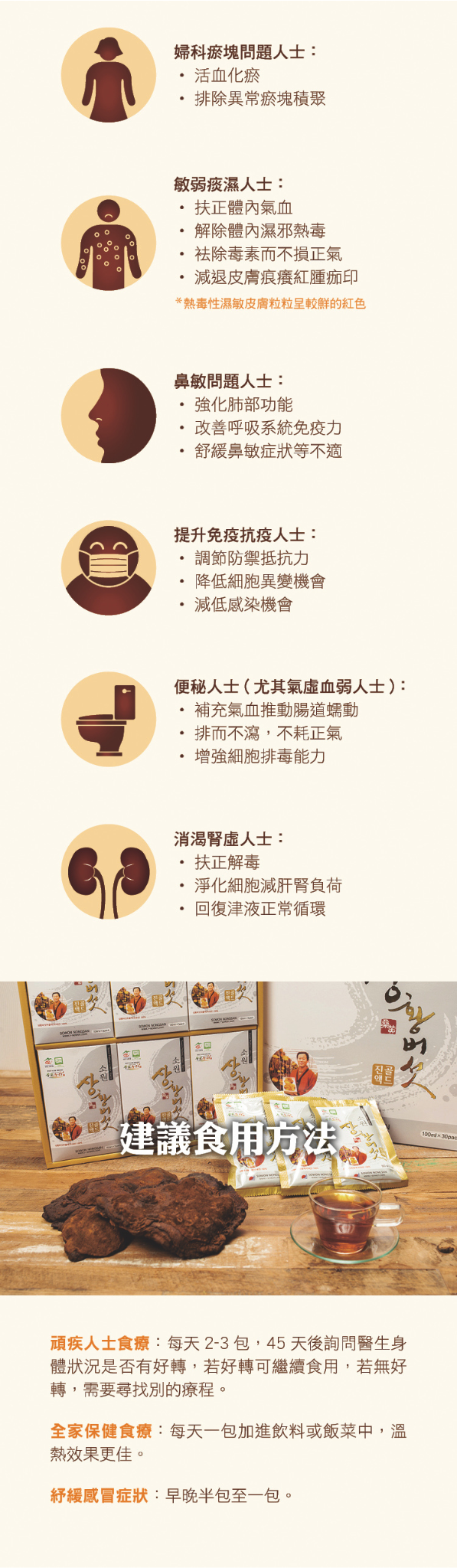 適合人士:所有頑症人士、調理婦科問題、便秘、消渴腎虛、抗濕敏、鼻敏、抗炎等人士及提高自身免疫力之保健人士。